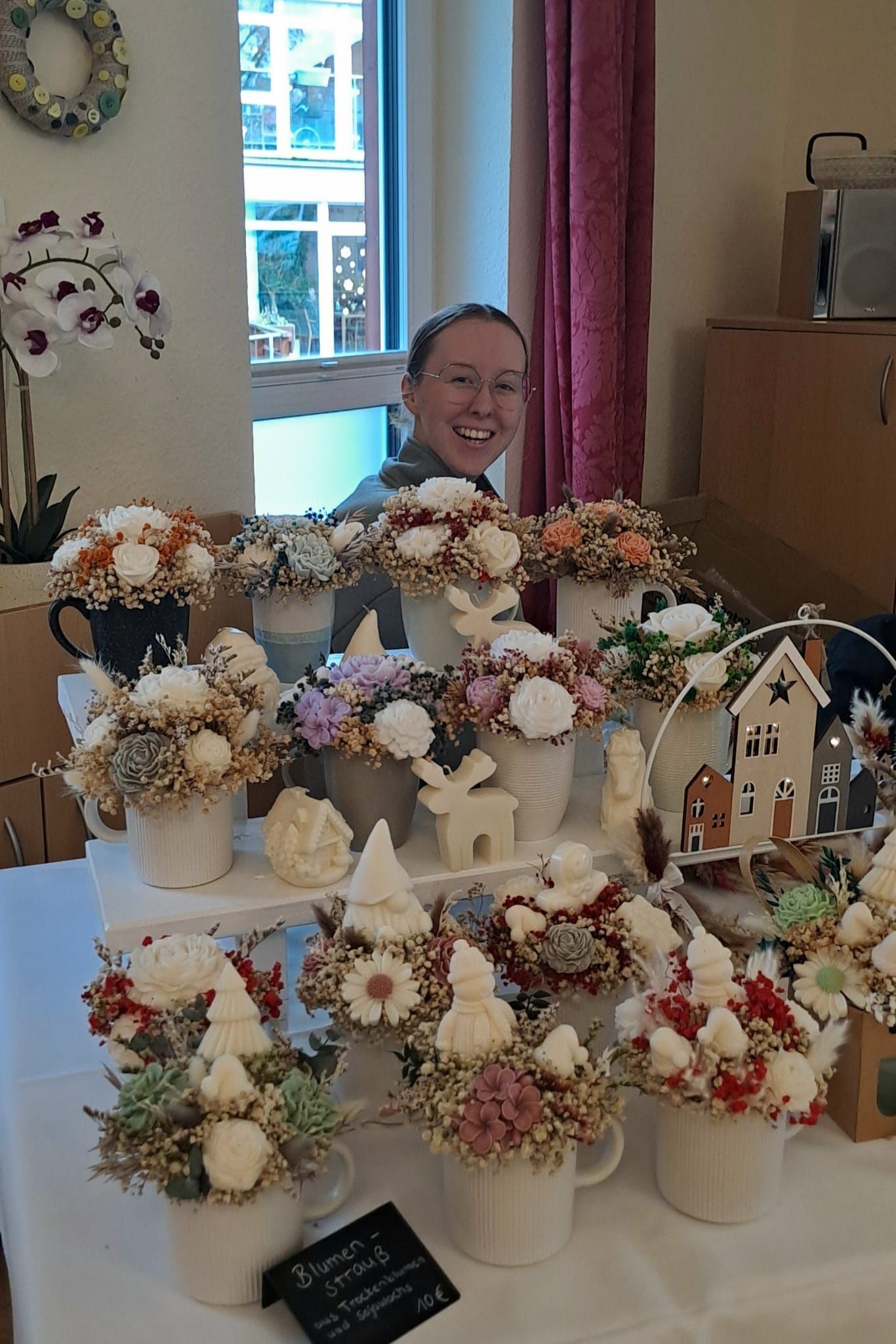Louisenstifts als auch Angehörige bei uns zu Gast. Bei Kaffee, Punsch und frischgebackenen Waffeln kamen alle gut ins Gespräch und es wurde geklönt, geschnackt und natürlich auch gekauft.