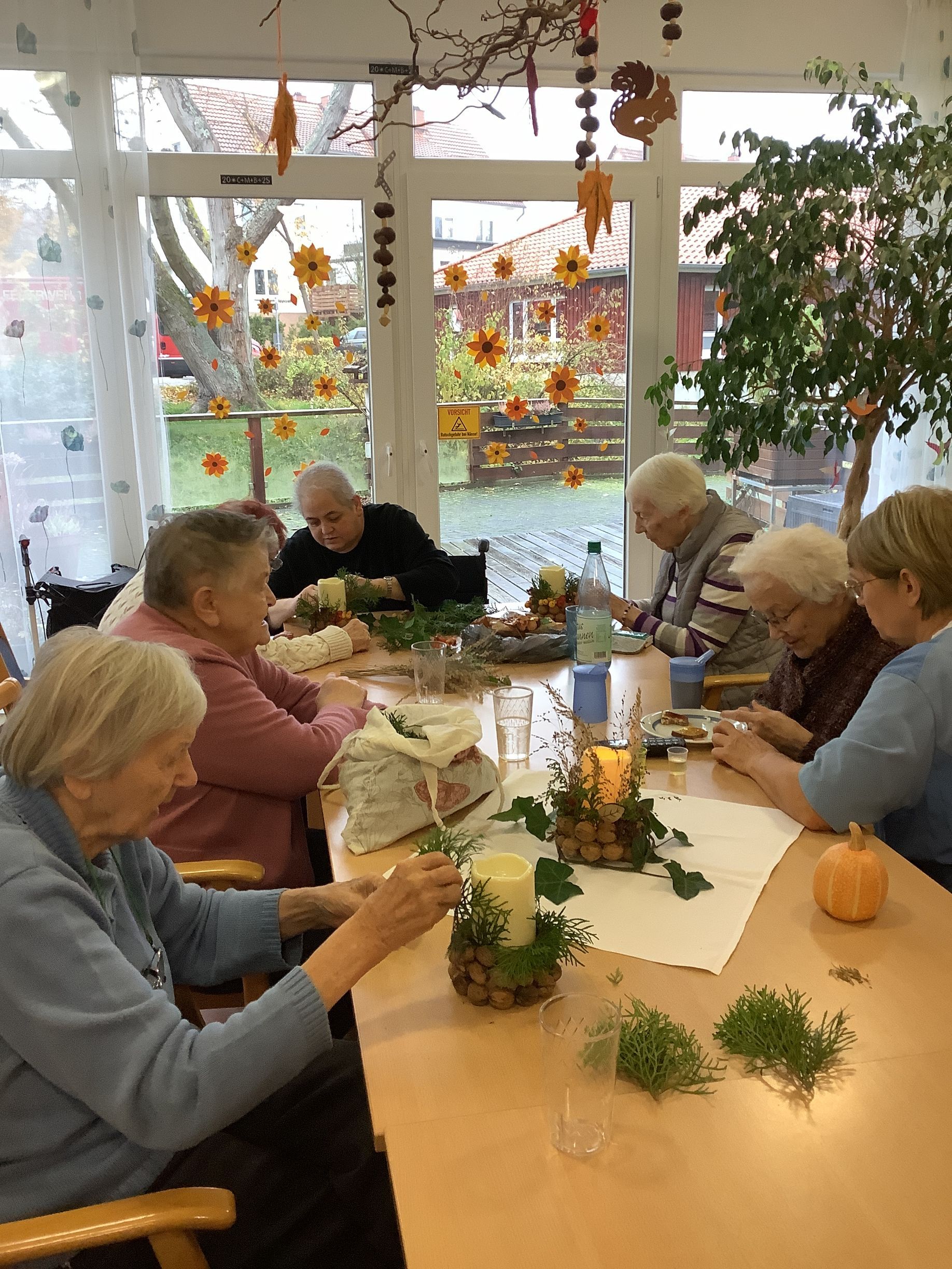 Wir haben mit den Bewohnern eine schöne Winterdeko für den Tisch gebastelt – alles aus Naturmaterialien. Die Walnusskerzenhalter wurden hübsch geschmückt und dekoriert. So macht der Start in die kalte Jahreszeit Spaß.